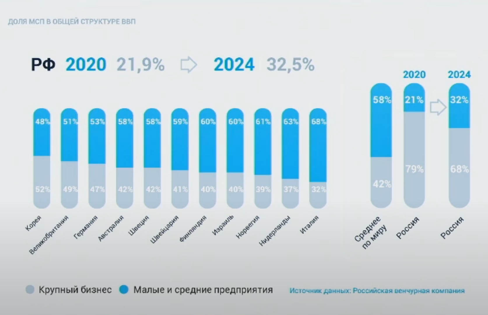 Согласно статистике Российской венчурной компании (РВК), средний показатель участия зарубежного малого и среднего предпринимательства в структуре ВВП по миру составляет 58%. В нашей стране этот «индекс» едва превышает 20%. Как говорится, почувствуйте разницу. Правда, национальные проекты, внедрение которых инициировали «майские», 2012 года указы Президента России, как раз и призваны кардинально изменить ситуацию в лучшую сторону, усилить роль малого и среднего бизнеса для обеспечения большей стабильности отечественной экономики и самозанятых, а также довести долю нашего МСП в общей структуре национального ВВП до 32,5% к 2024 году.