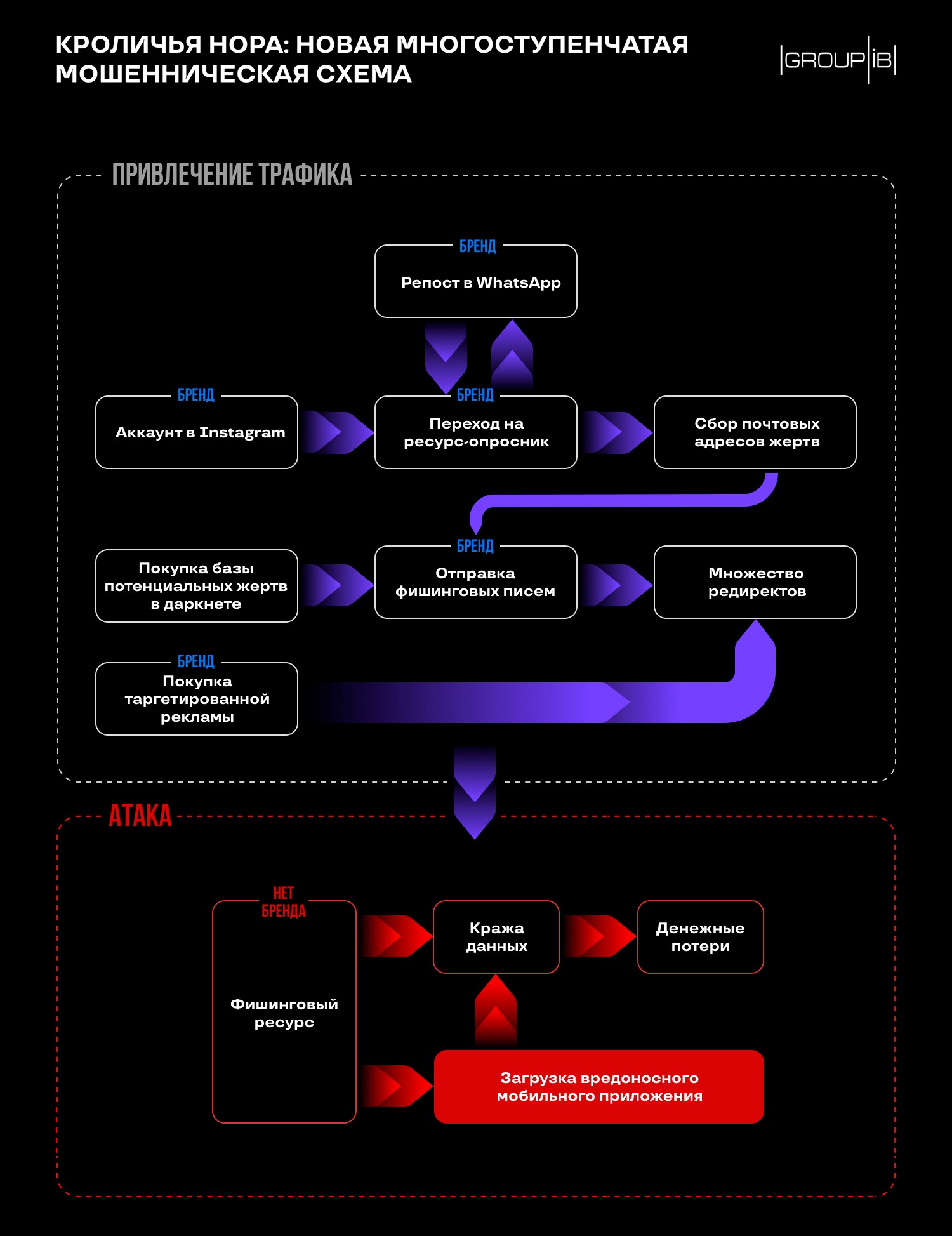 Однако, по словам представителя Group-IB, опасность «Кроличьей норы» еще и в том, что от нее страдают не только частные лица: репутационный ущерб несут крупные бренды, не говоря уже о селебрити, чьи имена и изображения эксплуатируют мошенники. Почти 64% пользователей, втянутых в интернет-мошенничество с конкретным брендом, уже никогда не вернутся к нему – доверие подорвано.