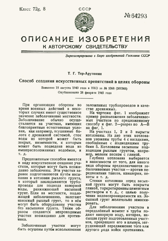 Таким вот образом предлагал изобретатель Тер-Арутюнян создавать непроходимые заболоченные участки-плывуны, неожиданные для неприятеля.