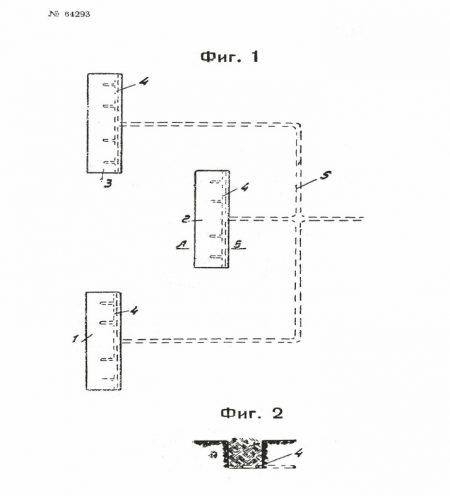 На приложенном к заявке чертеже изобретатель начертил фиг. (фигурой) 1 пример расположения заболачиваемых участков по предложенному способу и фиг. 2 – разрез по А–В (на фиг. 1). На участках 1, 2 и 3 изображены вырытые котлованы. На их дно уложены трубы 4 с насадками, которые сообщены с подводящими трубами 5. Безусловно, при этом автор подразумевал, что котлованы засыпаны подходящим рыхлым грунтом.
