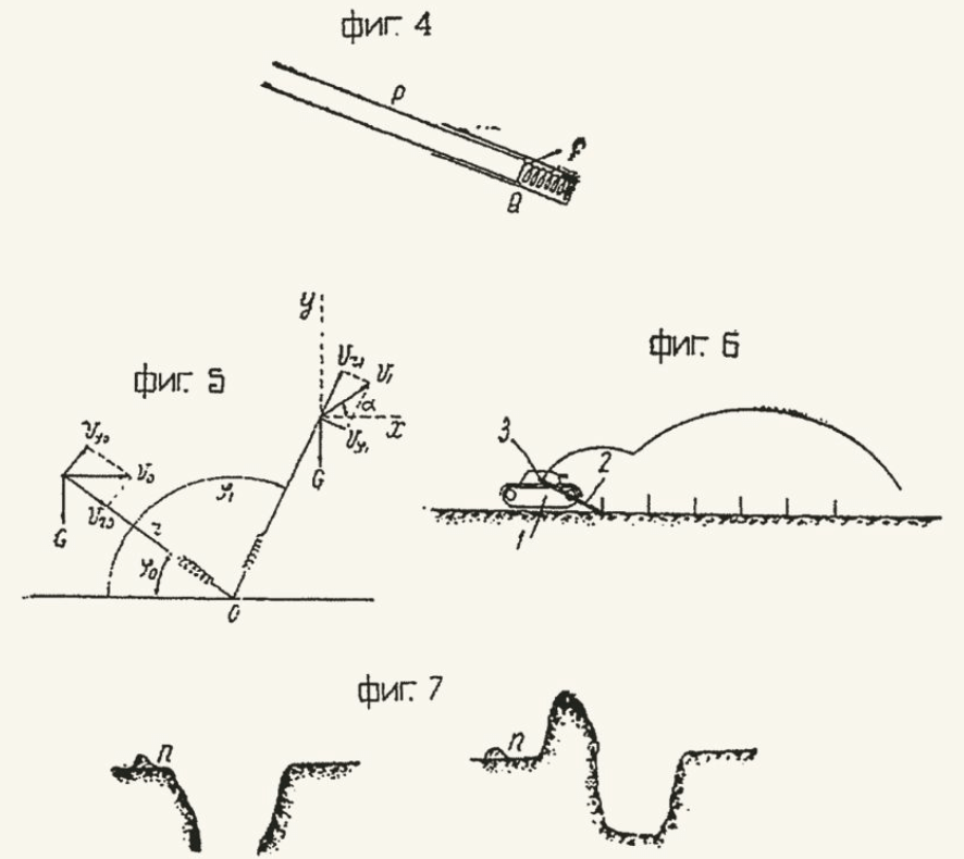 На схемах, которые иллюстрируют изобретение Ботвинника, изображены: фиг. (фигура) 1 – различные типы противотанковых препятствий; фиг. 2 – танк, снаряженный согласно изобретению рамой для выполнения прыжка через препятствие; фиг. 3 – схема движения танка во время прыжка; фиг. 4 – рама с пружинным упором для удлинения траектории прыжка; фиг. 5 – схема движения для танка, снабженного такой рамой; фиг. 6 – траектория прыжка танка; фиг. 7 – различные типы препятствий с искусственным упором перед ними.