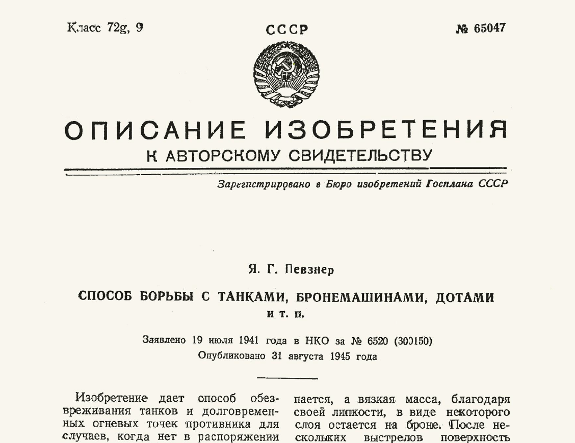 Не меньшей оригинальностью отличается и изобретение под названием «Способ борьбы с танками, бронемашинами, дотами и т.п.» (заявлено в Народный комиссариат обороны [НКО] 19 июля 1941 года), за которое его разработчик Я. Г. Певзнер получил авторское свидетельство № 65047 СССР.