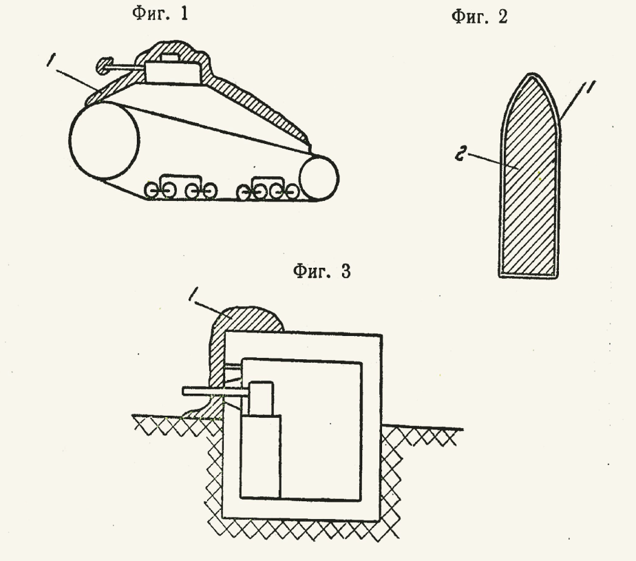 Для образования плотной «корки» изобретатель Певзнер предложил обстреливать танки специальными залепливающими снарядами (фиг. 2). Этот снаряд состоял из тонкой оболочки 1, наполненной вяжущей массой. При выстреле из орудия снаряд попадал на поверхность танка, оболочка рассыпалась, а вязкая масса благодаря своей липкости в виде некоторого слоя оставалась на броне. После нескольких выстрелов поверхность танка покрывалась вязкой массой, которая плотно закрывала все смотровые отверстия и обезвреживала танк. Для устранения излишнего разбрызгивания массы при ударе о броню заряд при выстреле мог быть уменьшенным.